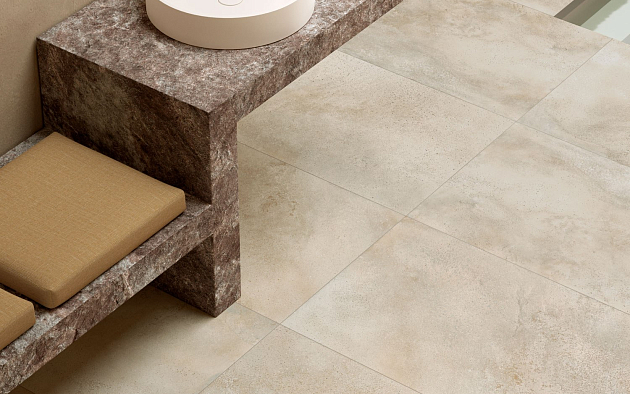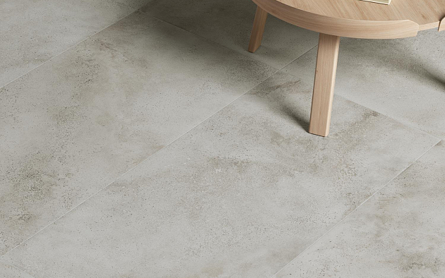 Этой осенью ассортимент Coliseum пополнился коллекцией Monza — керамогранитом в формате 60×120 см, воспроизводящим эстетику необработанного бетона. Главная особенность серии заключается в способе создания дизайна: графика плитки разработана на основе реальных цементных образцов, изготовленных мастером вручную. Такой подход позволил добиться максимально достоверной передачи текстуры — с характерными разводами, неравномерностью тона и мелкими минеральными включениями, которые обычно появляются на поверхности свежего бетона при естественном высыхании.